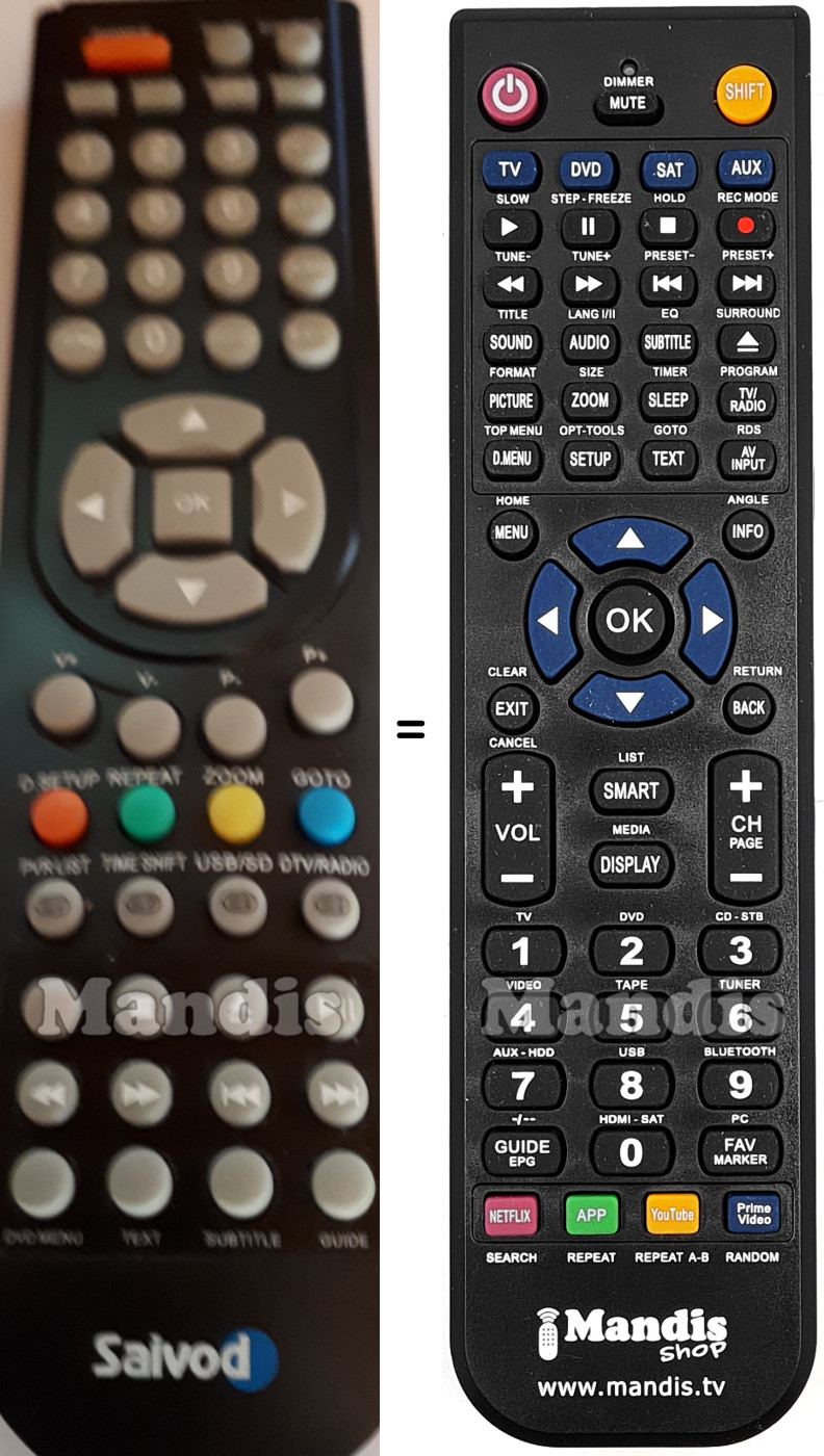 Abaixo, mostraremos a correspondência entre cada botão no controle remoto original e o botão que executa a mesma função no controle remoto de substituição. Em alguns casos, pode ser necessário pressionar a tecla SHIFT antes de pressionar outro botão para realizar determinadas ações. Essas funções adicionais geralmente não são amplamente utilizadas e são incluídas para facilitar o entendimento do controle remoto de substituição, ou porque o controle remoto original tem mais botões do que seu equivalente.