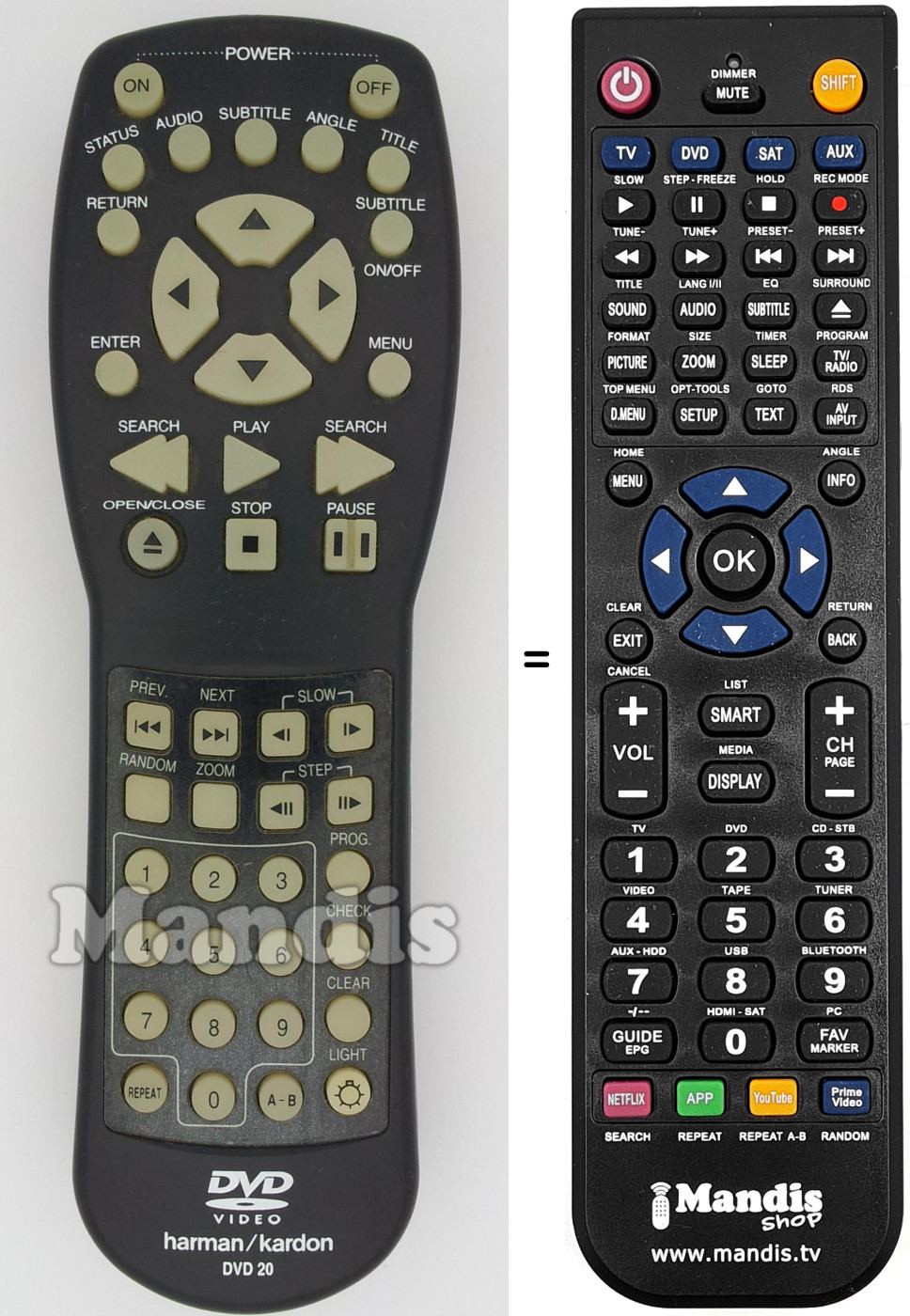 Abaixo, mostraremos a correspondência entre cada botão no controle remoto original e o botão que executa a mesma função no controle remoto de substituição. Em alguns casos, pode ser necessário pressionar a tecla SHIFT antes de pressionar outro botão para realizar determinadas ações. Essas funções adicionais geralmente não são amplamente utilizadas e são incluídas para facilitar o entendimento do controle remoto de substituição, ou porque o controle remoto original tem mais botões do que seu equivalente.