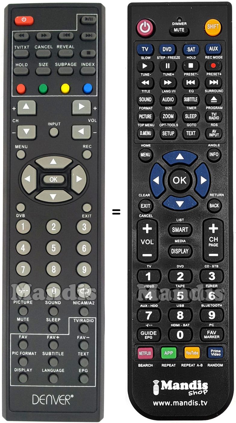 Abaixo, mostraremos a correspondência entre cada botão no controle remoto original e o botão que executa a mesma função no controle remoto de substituição. Em alguns casos, pode ser necessário pressionar a tecla SHIFT antes de pressionar outro botão para realizar determinadas ações. Essas funções adicionais geralmente não são amplamente utilizadas e são incluídas para facilitar o entendimento do controle remoto de substituição, ou porque o controle remoto original tem mais botões do que seu equivalente.