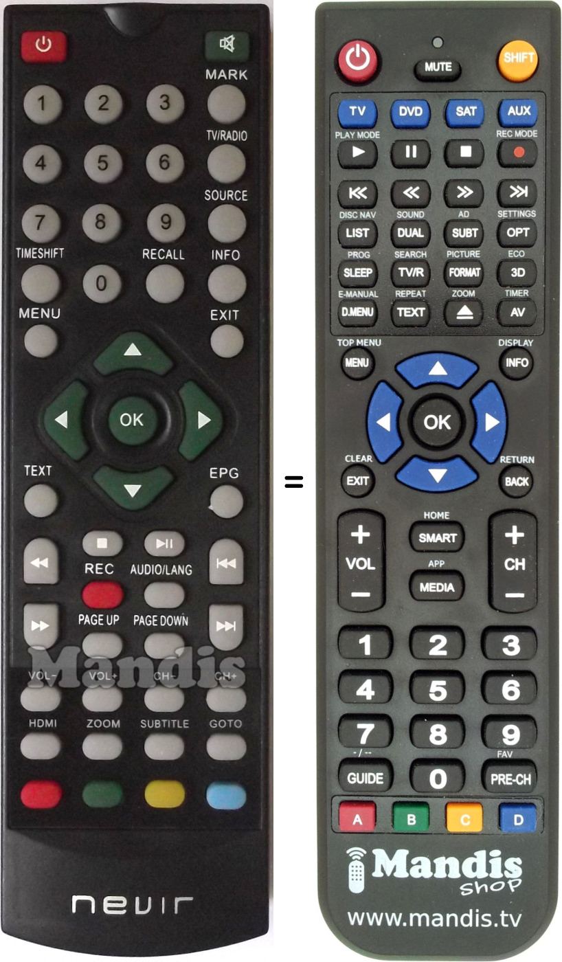 Abaixo, mostraremos a correspondência entre cada botão no controle remoto original e o botão que executa a mesma função no controle remoto de substituição. Em alguns casos, pode ser necessário pressionar a tecla SHIFT antes de pressionar outro botão para realizar determinadas ações. Essas funções adicionais geralmente não são amplamente utilizadas e são incluídas para facilitar o entendimento do controle remoto de substituição, ou porque o controle remoto original tem mais botões do que seu equivalente.