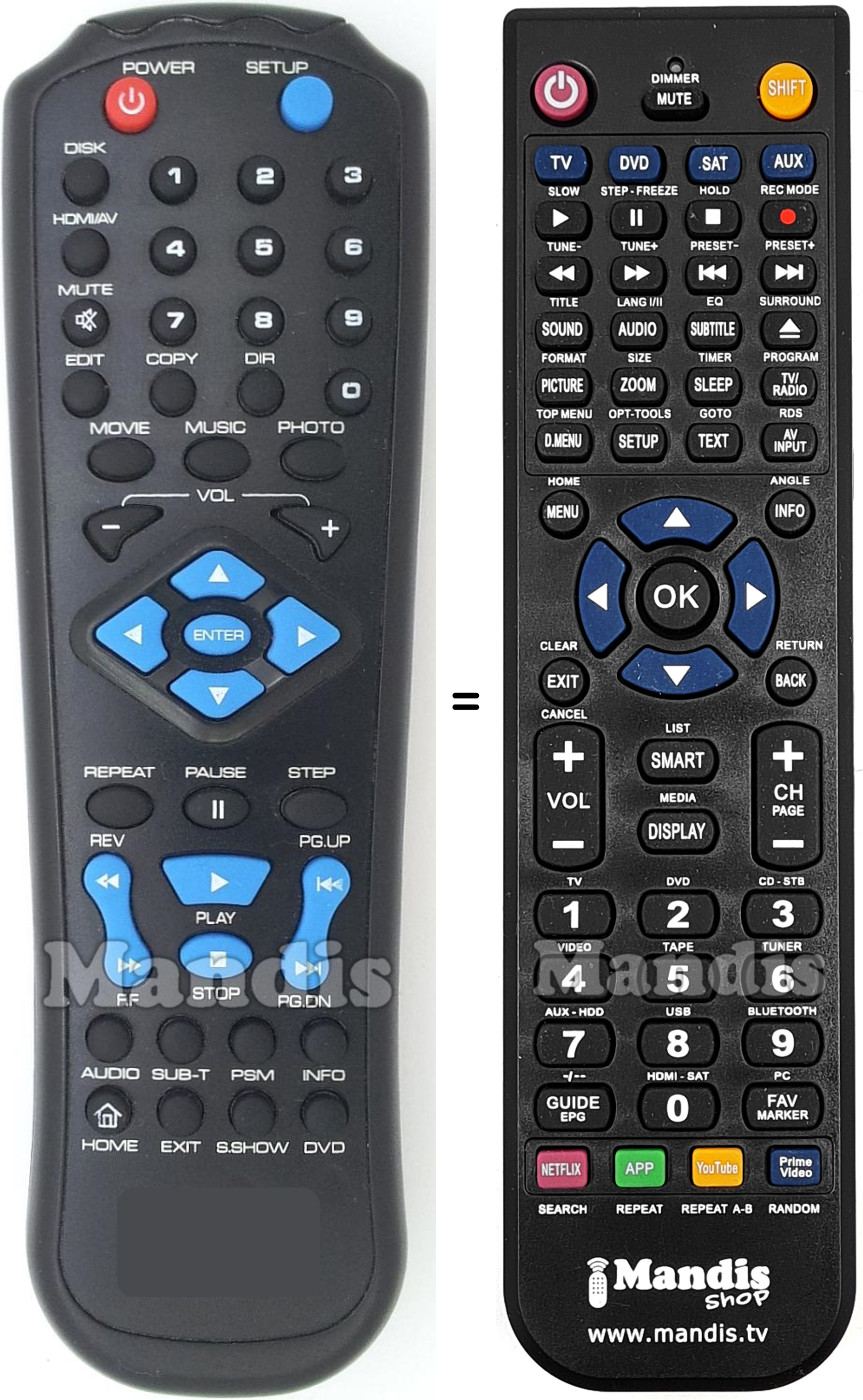 Abaixo, mostraremos a correspondência entre cada botão no controle remoto original e o botão que executa a mesma função no controle remoto de substituição. Em alguns casos, pode ser necessário pressionar a tecla SHIFT antes de pressionar outro botão para realizar determinadas ações. Essas funções adicionais geralmente não são amplamente utilizadas e são incluídas para facilitar o entendimento do controle remoto de substituição, ou porque o controle remoto original tem mais botões do que seu equivalente.