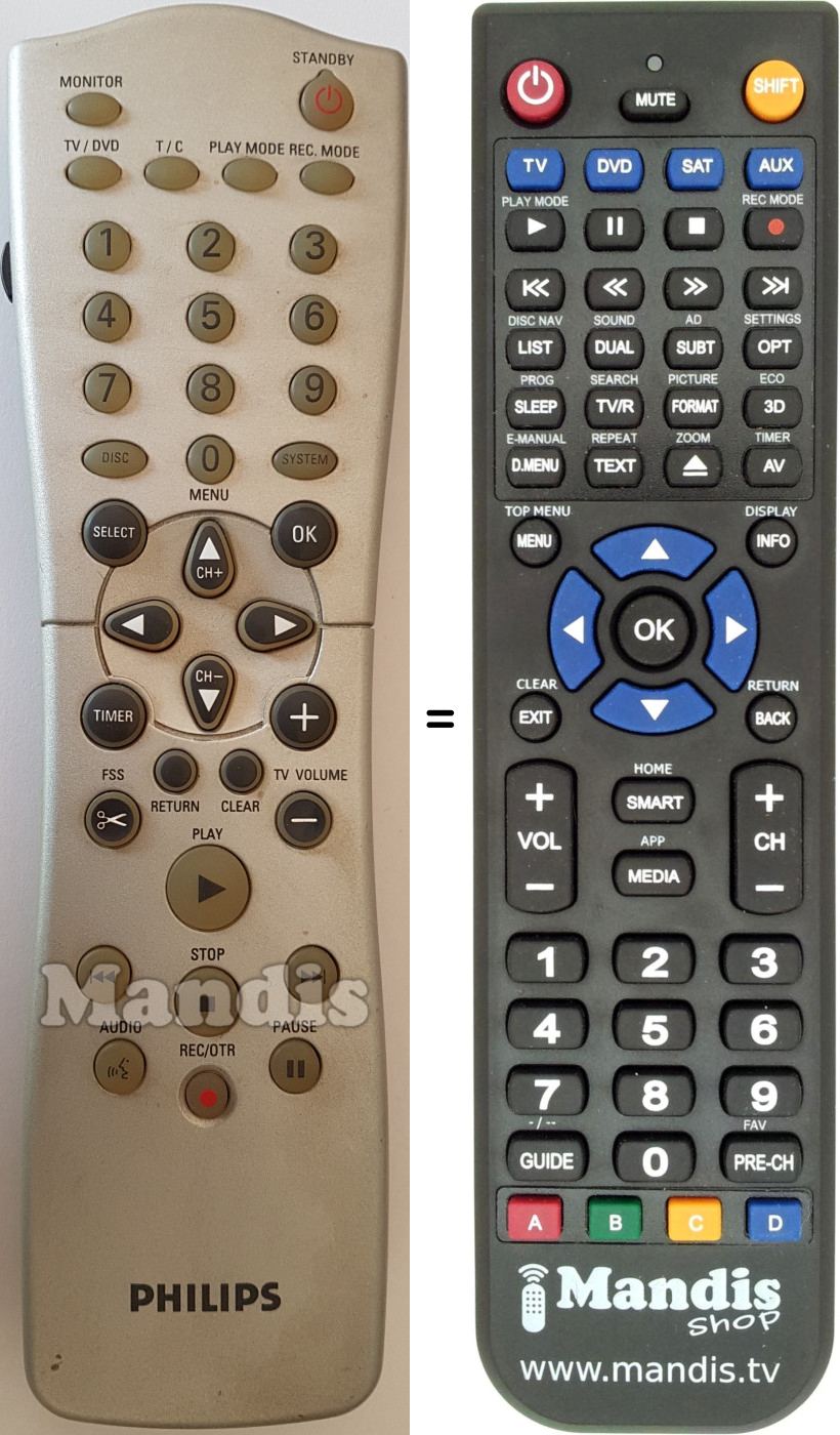 Abaixo, mostraremos a correspondência entre cada botão no controle remoto original e o botão que executa a mesma função no controle remoto de substituição. Em alguns casos, pode ser necessário pressionar a tecla SHIFT antes de pressionar outro botão para realizar determinadas ações. Essas funções adicionais geralmente não são amplamente utilizadas e são incluídas para facilitar o entendimento do controle remoto de substituição, ou porque o controle remoto original tem mais botões do que seu equivalente.