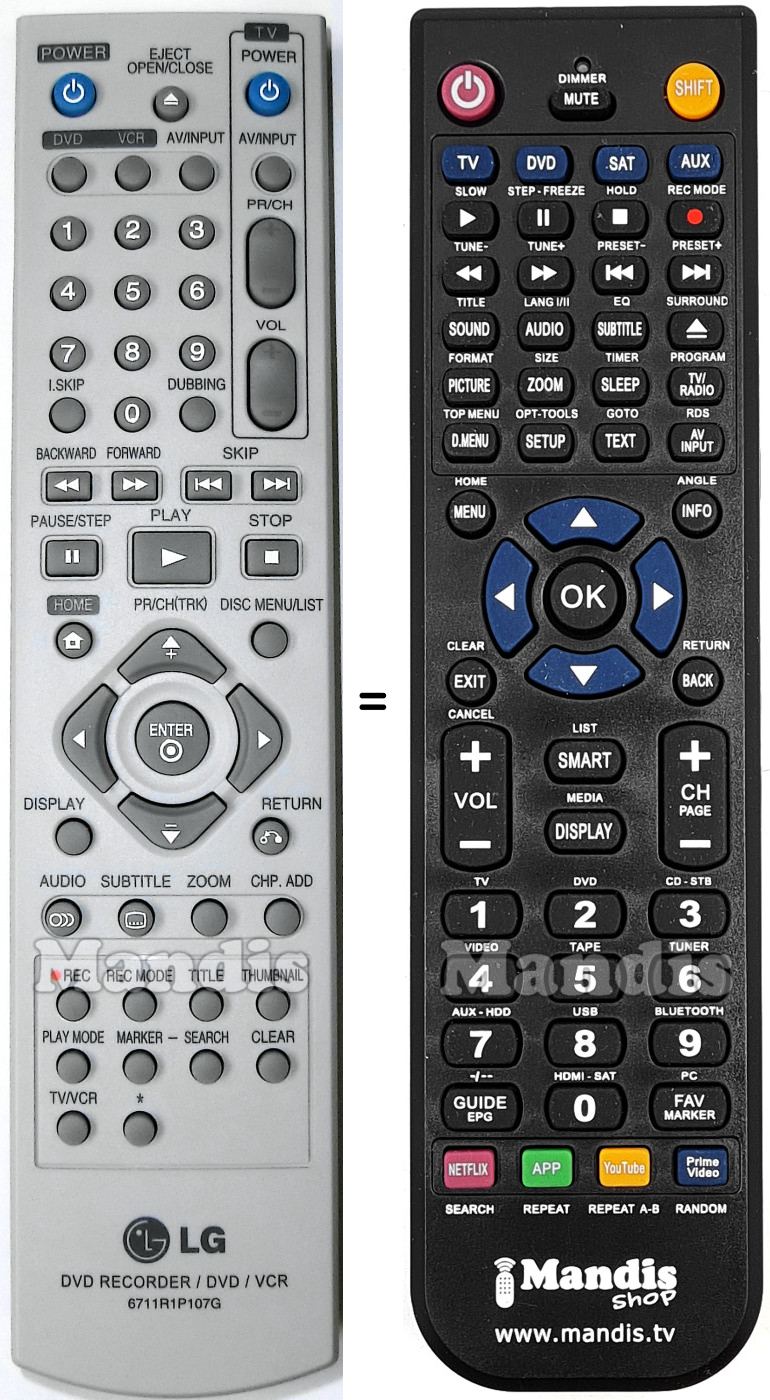 Abaixo, mostraremos a correspondência entre cada botão no controle remoto original e o botão que executa a mesma função no controle remoto de substituição. Em alguns casos, pode ser necessário pressionar a tecla SHIFT antes de pressionar outro botão para realizar determinadas ações. Essas funções adicionais geralmente não são amplamente utilizadas e são incluídas para facilitar o entendimento do controle remoto de substituição, ou porque o controle remoto original tem mais botões do que seu equivalente.