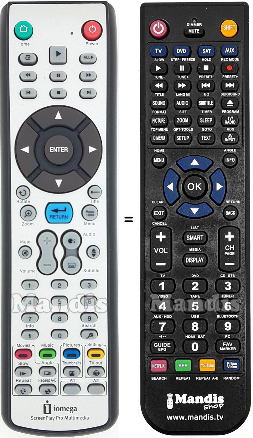 Abaixo, mostraremos a correspondência entre cada botão no controle remoto original e o botão que executa a mesma função no controle remoto de substituição. Em alguns casos, pode ser necessário pressionar a tecla SHIFT antes de pressionar outro botão para realizar determinadas ações. Essas funções adicionais geralmente não são amplamente utilizadas e são incluídas para facilitar o entendimento do controle remoto de substituição, ou porque o controle remoto original tem mais botões do que seu equivalente.