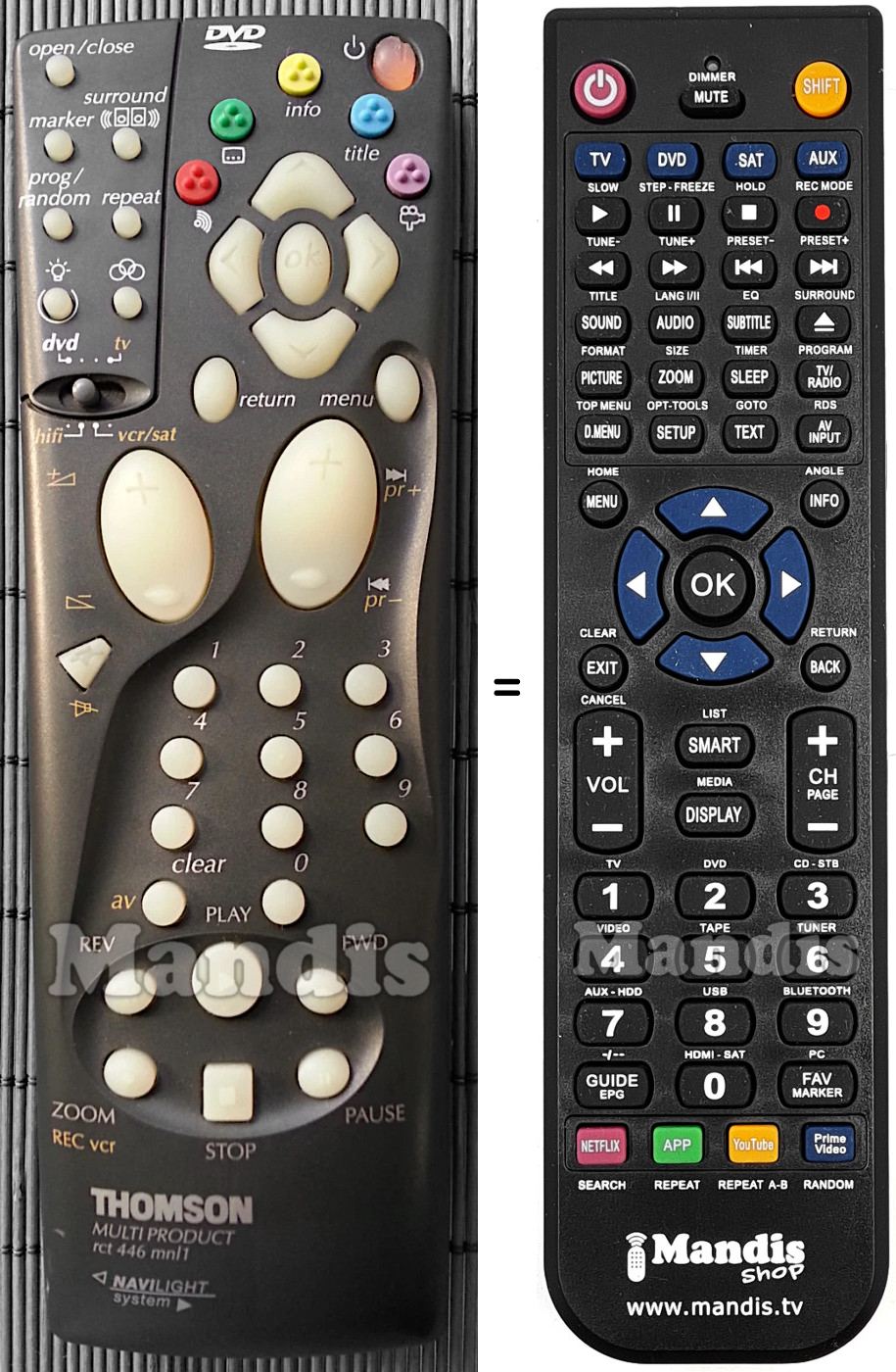 Abaixo, mostraremos a correspondência entre cada botão no controle remoto original e o botão que executa a mesma função no controle remoto de substituição. Em alguns casos, pode ser necessário pressionar a tecla SHIFT antes de pressionar outro botão para realizar determinadas ações. Essas funções adicionais geralmente não são amplamente utilizadas e são incluídas para facilitar o entendimento do controle remoto de substituição, ou porque o controle remoto original tem mais botões do que seu equivalente.