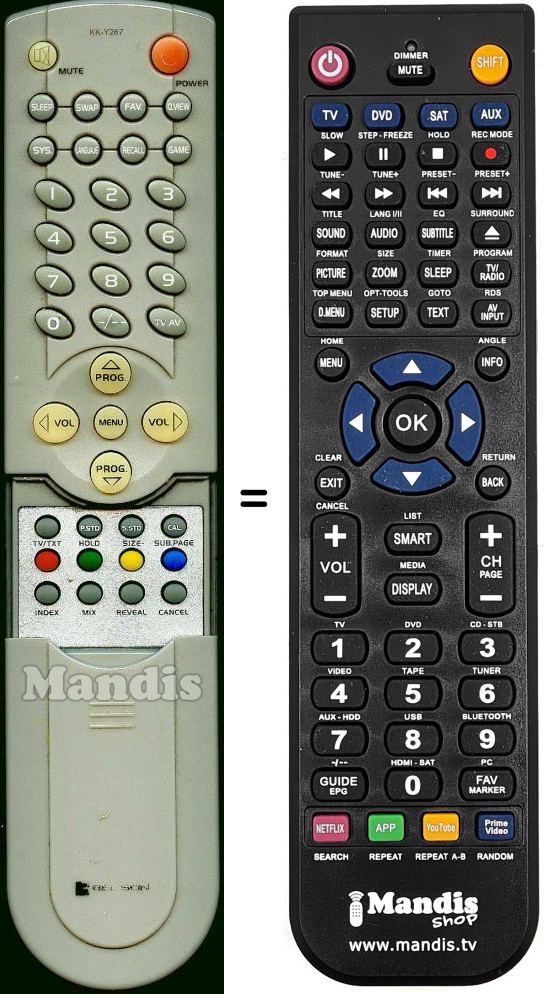 Comando à distância que substitui o original KK-Y267 em todas as suas funções.