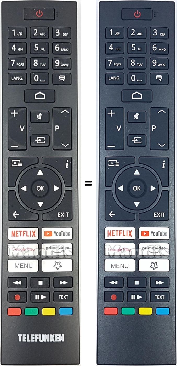 Power, 1, 2, 3, 4, 5, 6, 7, 8, 9, 0, Lang, [=].., Home, Mute, Source, V+, V-, P+, P-, [G], i, Exit, ←, Up, Down, Right, Left, OK, Netflix, YouTube, Google PLay, prime video, Menu, ☼1, <<, Stop, >>, Text, Pause/Play, Rec, Red, Green, Yellow, Blue