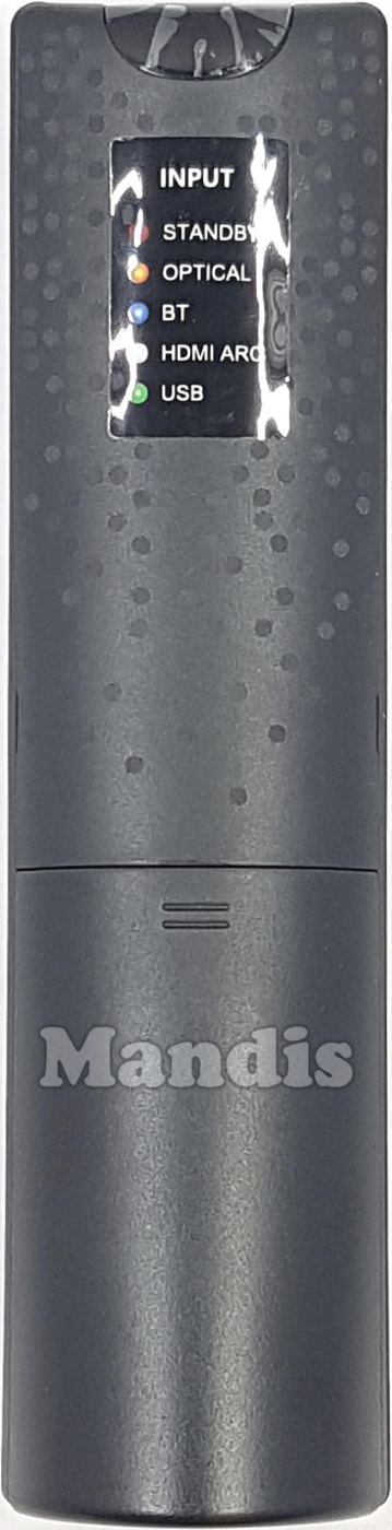 Este controle remoto possui os seguintes botões: Power, Input, Mute, Music, News, Vol+, Vol-, >>I, I<<, Play/Pause/Bluetooth, SURR, Movie, Night, Bass+, Bass-