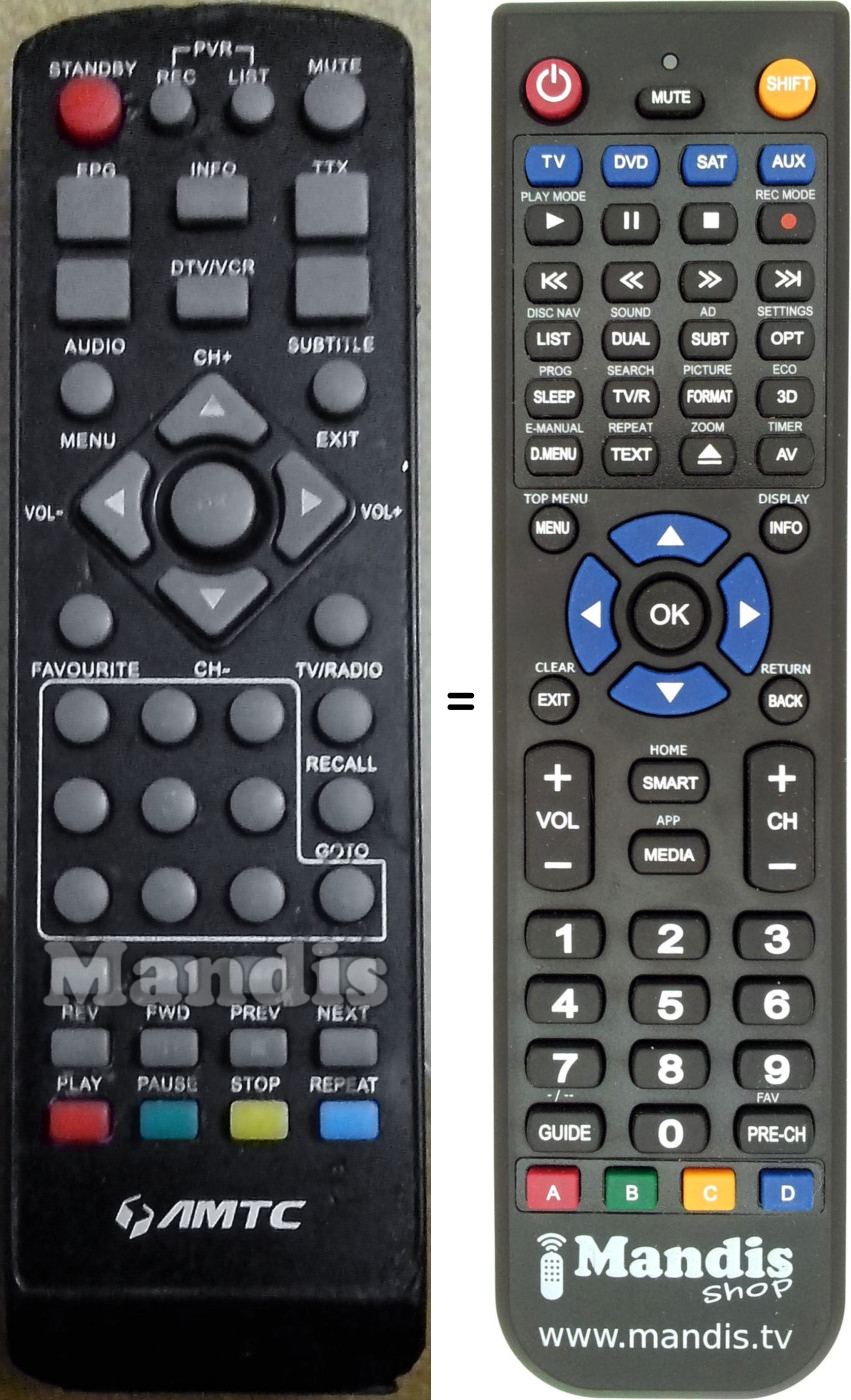 Abaixo, mostraremos a correspondência entre cada botão no controle remoto original e o botão que executa a mesma função no controle remoto de substituição. Em alguns casos, pode ser necessário pressionar a tecla SHIFT antes de pressionar outro botão para realizar determinadas ações. Essas funções adicionais geralmente não são amplamente utilizadas e são incluídas para facilitar o entendimento do controle remoto de substituição, ou porque o controle remoto original tem mais botões do que seu equivalente.