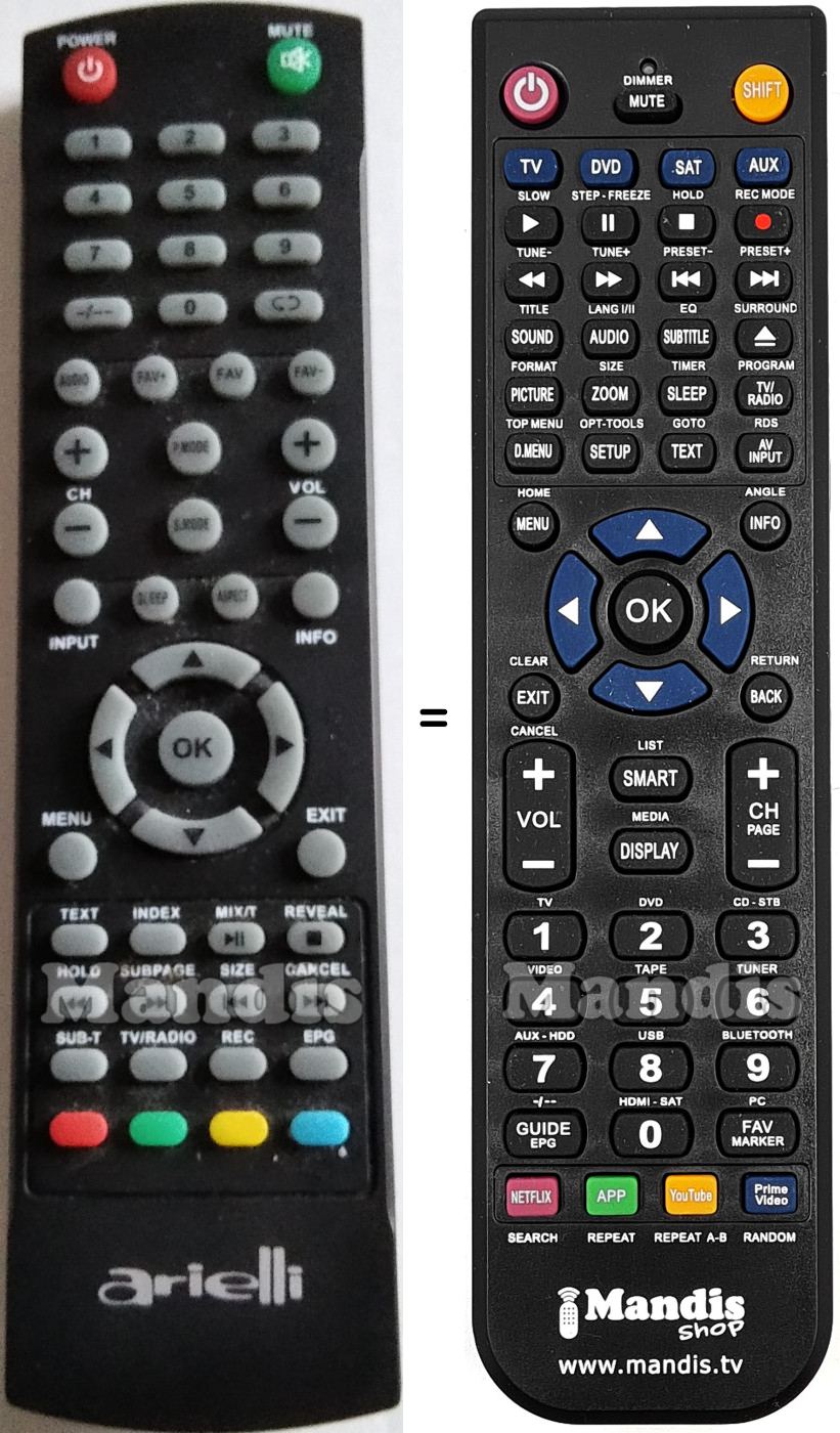 Abaixo, mostraremos a correspondência entre cada botão no controle remoto original e o botão que executa a mesma função no controle remoto de substituição. Em alguns casos, pode ser necessário pressionar a tecla SHIFT antes de pressionar outro botão para realizar determinadas ações. Essas funções adicionais geralmente não são amplamente utilizadas e são incluídas para facilitar o entendimento do controle remoto de substituição, ou porque o controle remoto original tem mais botões do que seu equivalente.