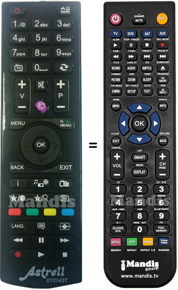 Abaixo, mostraremos a correspondência entre cada botão no controle remoto original e o botão que executa a mesma função no controle remoto de substituição. Em alguns casos, pode ser necessário pressionar a tecla SHIFT antes de pressionar outro botão para realizar determinadas ações. Essas funções adicionais geralmente não são amplamente utilizadas e são incluídas para facilitar o entendimento do controle remoto de substituição, ou porque o controle remoto original tem mais botões do que seu equivalente.