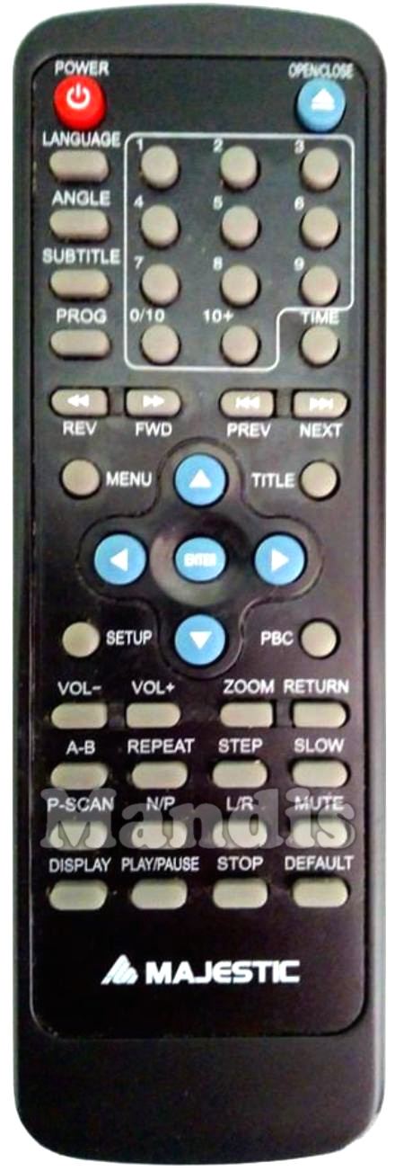 Power, Open / Close, Language, Angle, Subtitle, Prog, 1, 2, 3, 4, 5, 6, 7, 8, 9, 0/10, 10+, Time, << REV, >> FWD, I<< Prev, >>I Next, Menu, Title, Up, Right, Down, Left, Enter, SEtup, PBC, Vol -, Vol +, Zoom, Return, A-B, Repeat, Step, Slow, P-Scan, N/P, L/R, Mute, Display, Play / Pause, Stop, Default