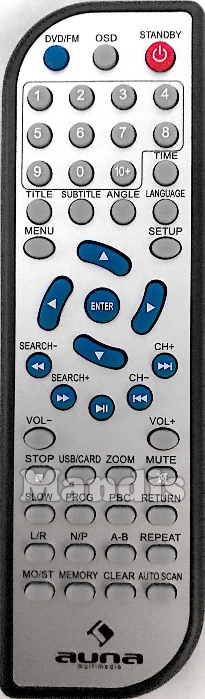 DVD/FM, OSD, Standby, 1, 2, 3, 4, 5, 6, 7, 8, 9, 0, 10+, Time, Title, Subtitle, Angle, Language, Menu, Setup, Up, Left, Enter, Right, Down, << / Search-, >> / Search+, Play / Pause, I<< / CH-, >>I / CH+, Vol-, Vol+, Stop, USB/CARD, Zoom, Mute, Slow, Prog, PBC, Return, L/R, N/P, A-B, Repeat, Mo/St, Memory, Clear, Auto Scan