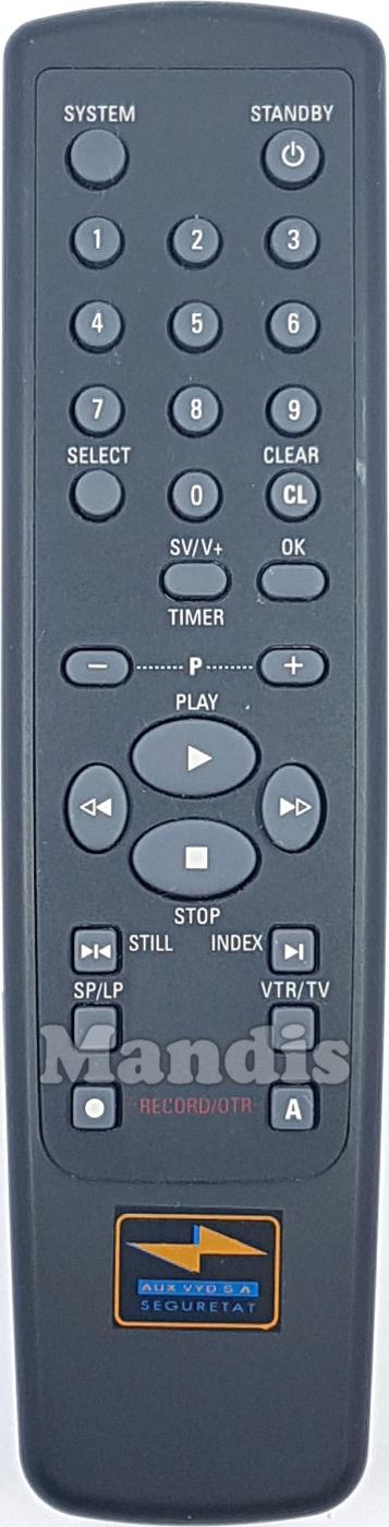 Standby, System, 1, 2, 3, 4, 5, 6, 7, 8, 9, 0, Selct, CL/Clear, SV/V+/Timer, OK, P+, P-, Play, Stop, <<, >>, >I< Still, Index I>, SP/LP, VTR/TV, Record/OTR A, Rec Record/OTR