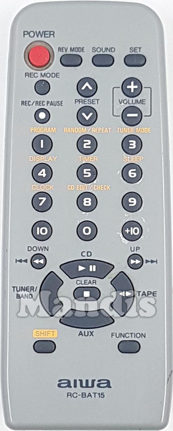 Comando à distância original RC-BAT15 que serve para sistema hi-fi da marca Aiwa. Trata-se de um modelo original de comando à distância.