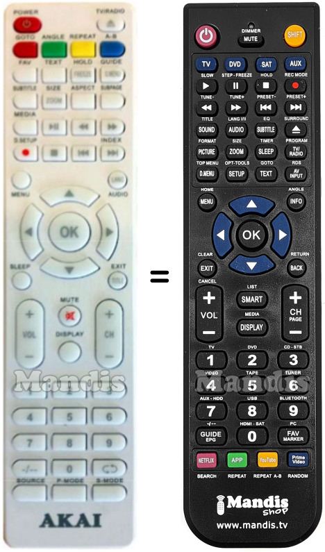 Abaixo, mostraremos a correspondência entre cada botão no controle remoto original e o botão que executa a mesma função no controle remoto de substituição. Em alguns casos, pode ser necessário pressionar a tecla SHIFT antes de pressionar outro botão para realizar determinadas ações. Essas funções adicionais geralmente não são amplamente utilizadas e são incluídas para facilitar o entendimento do controle remoto de substituição, ou porque o controle remoto original tem mais botões do que seu equivalente.