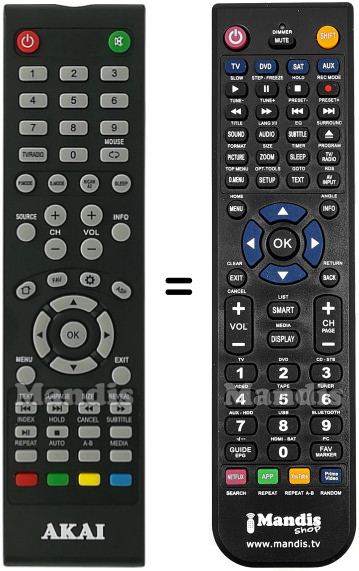 Abaixo, mostraremos a correspondência entre cada botão no controle remoto original e o botão que executa a mesma função no controle remoto de substituição. Em alguns casos, pode ser necessário pressionar a tecla SHIFT antes de pressionar outro botão para realizar determinadas ações. Essas funções adicionais geralmente não são amplamente utilizadas e são incluídas para facilitar o entendimento do controle remoto de substituição, ou porque o controle remoto original tem mais botões do que seu equivalente.