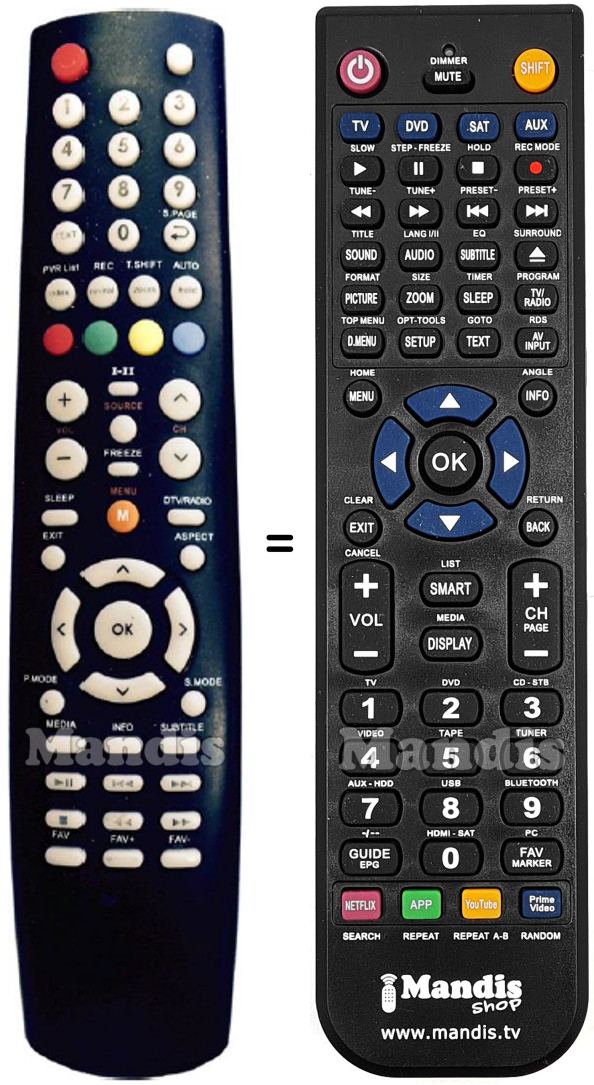 Abaixo, mostraremos a correspondência entre cada botão no controle remoto original e o botão que executa a mesma função no controle remoto de substituição. Em alguns casos, pode ser necessário pressionar a tecla SHIFT antes de pressionar outro botão para realizar determinadas ações. Essas funções adicionais geralmente não são amplamente utilizadas e são incluídas para facilitar o entendimento do controle remoto de substituição, ou porque o controle remoto original tem mais botões do que seu equivalente.
