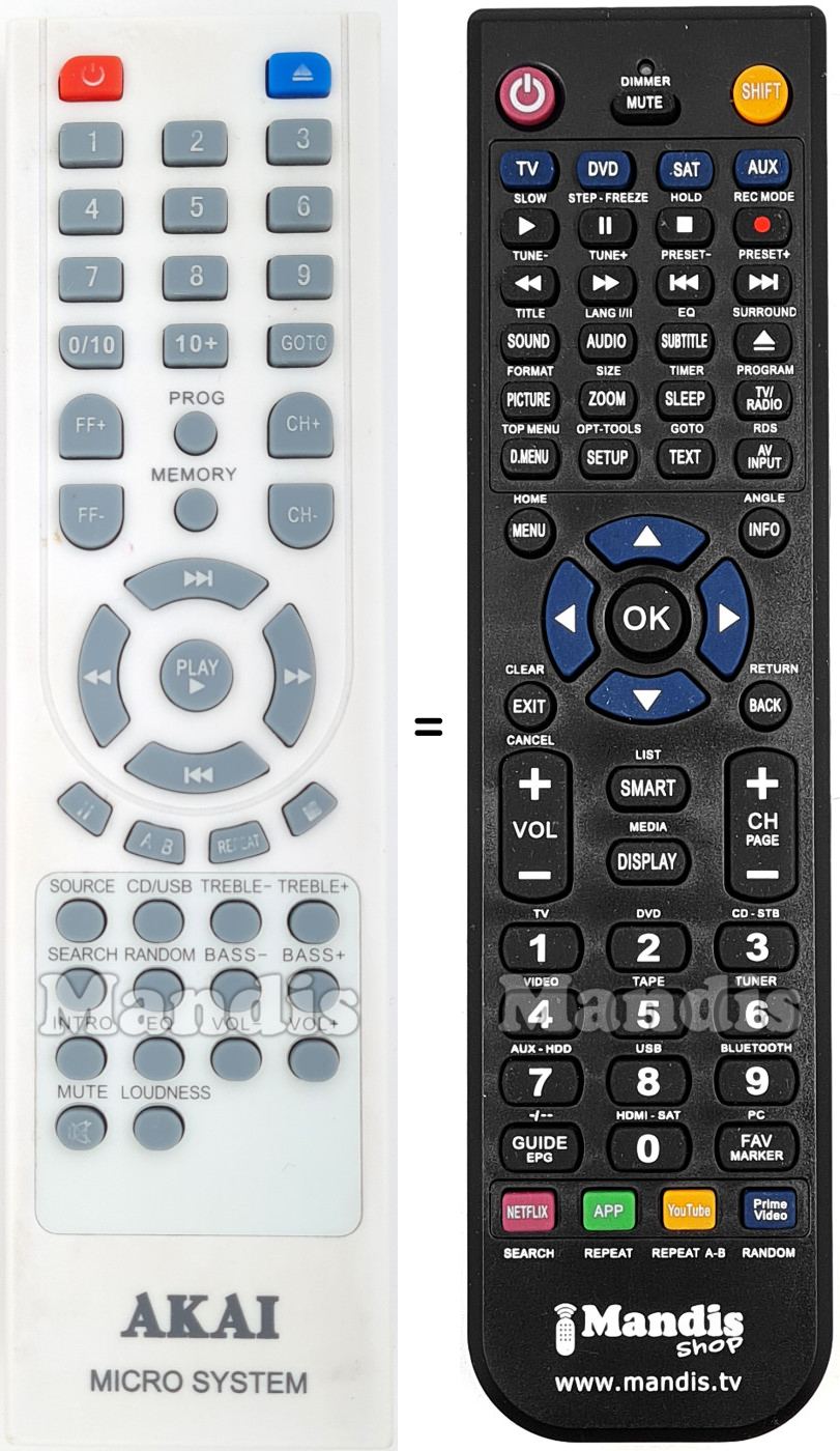 Abaixo, mostraremos a correspondência entre cada botão no controle remoto original e o botão que executa a mesma função no controle remoto de substituição. Em alguns casos, pode ser necessário pressionar a tecla SHIFT antes de pressionar outro botão para realizar determinadas ações. Essas funções adicionais geralmente não são amplamente utilizadas e são incluídas para facilitar o entendimento do controle remoto de substituição, ou porque o controle remoto original tem mais botões do que seu equivalente.