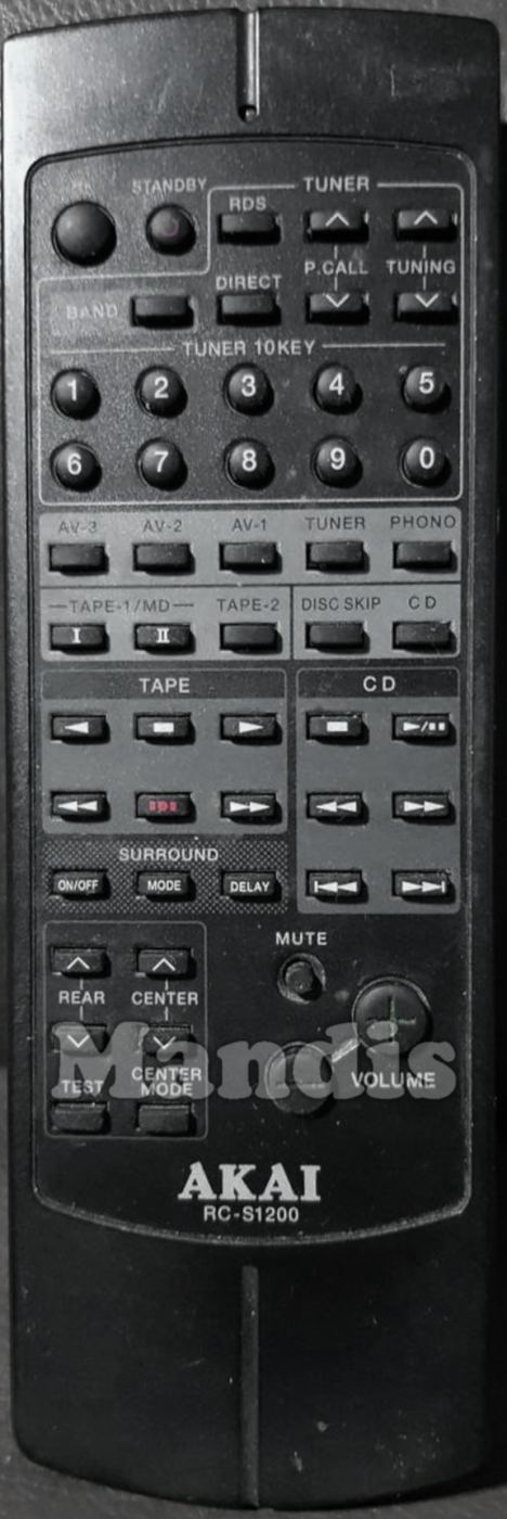 Comando à distância original RC-S1200 que serve para sistema hi-fi da marca Akai. Trata-se de um modelo original de comando à distância.