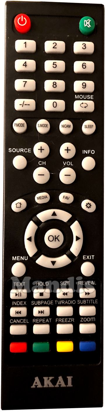 Power, Mute, 1, 2, 3, 4, 5, 6, 7, 8, 9, 0, -/--, Recall / Mouse, P.Mode, S.Mode, Nicam, Sleep, Source, CH+, CH-, Vol+, Vol-, Info, Home, Media, Fav, Settings, Up, Left, OK, Right, Down, Menu, Exit, Play/Pause / Text, Stop / Hold, << / Size, >> / Reveal, I<< / Index, >>I / Subpage, TV/Radio, Subtitle, Cancel, Repeat, Freezr, Zoom, Red, Green, Yellow, Blue