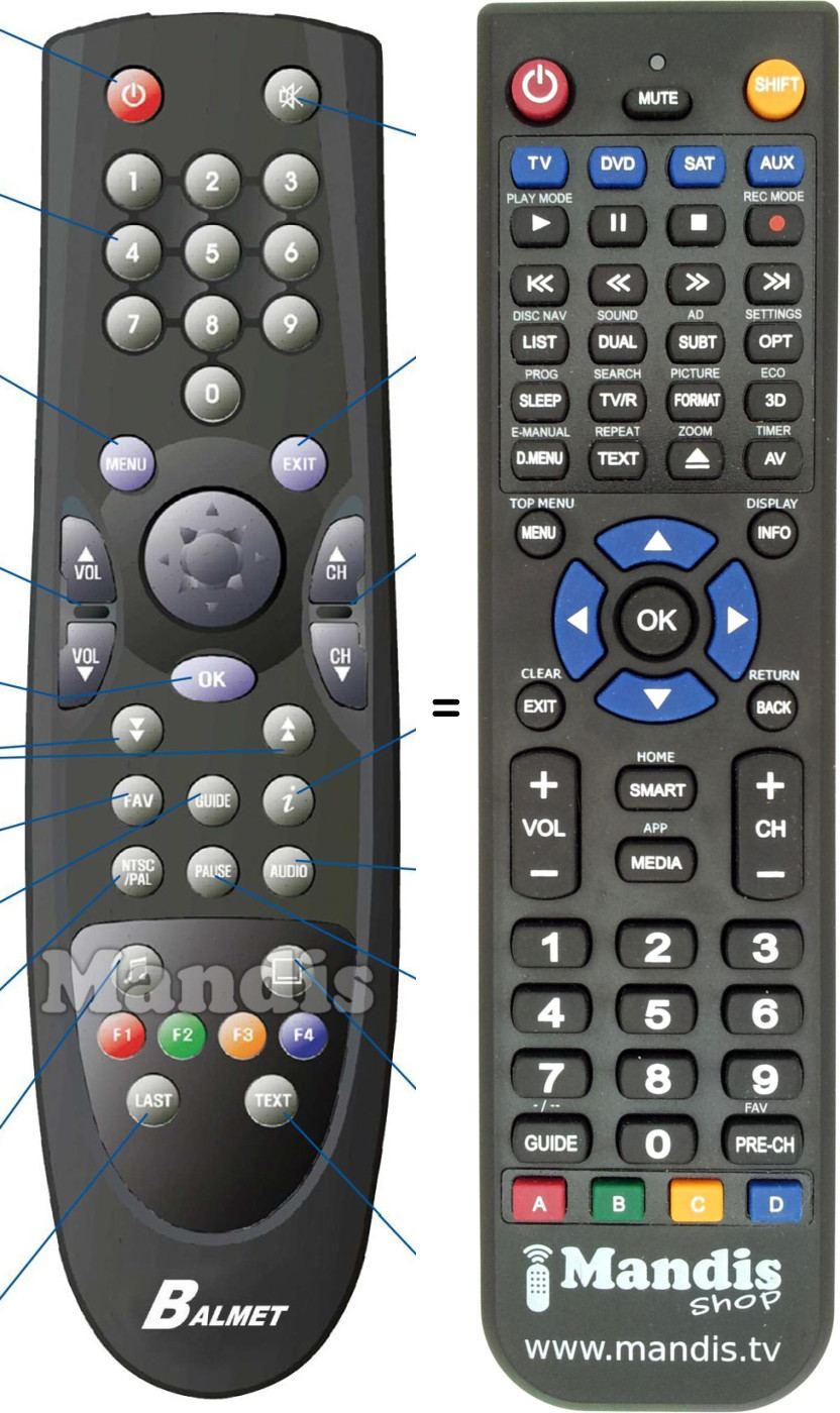 Abaixo, mostraremos a correspondência entre cada botão no controle remoto original e o botão que executa a mesma função no controle remoto de substituição. Em alguns casos, pode ser necessário pressionar a tecla SHIFT antes de pressionar outro botão para realizar determinadas ações. Essas funções adicionais geralmente não são amplamente utilizadas e são incluídas para facilitar o entendimento do controle remoto de substituição, ou porque o controle remoto original tem mais botões do que seu equivalente.