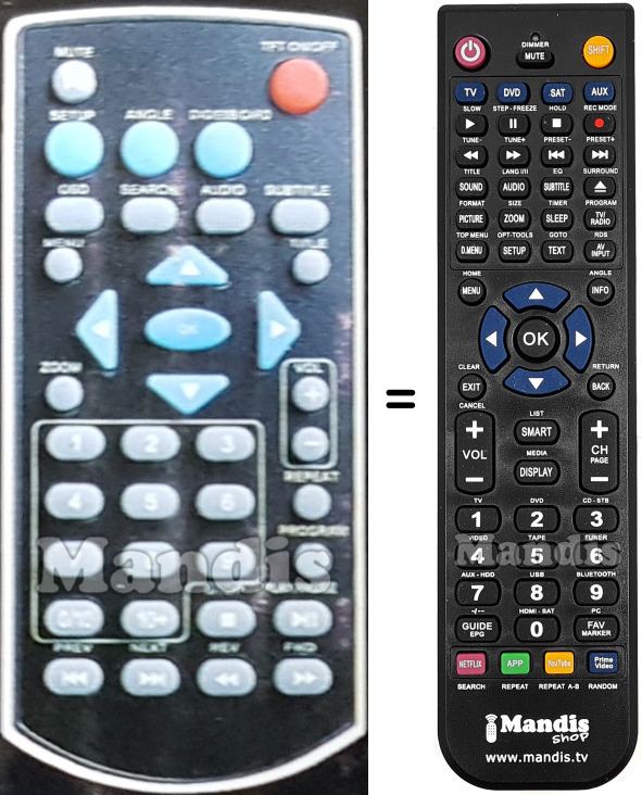 Abaixo, mostraremos a correspondência entre cada botão no controle remoto original e o botão que executa a mesma função no controle remoto de substituição. Em alguns casos, pode ser necessário pressionar a tecla SHIFT antes de pressionar outro botão para realizar determinadas ações. Essas funções adicionais geralmente não são amplamente utilizadas e são incluídas para facilitar o entendimento do controle remoto de substituição, ou porque o controle remoto original tem mais botões do que seu equivalente.