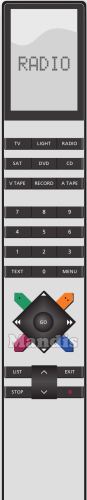 Radio, CD, A Tape, Record, 1, 2, 3, 4, 5, 6, 7, 8, 9, 0, Menu, Up, Down, Right, Left, GO, Red, Green, Yellow, Blue, List, Exit, Stop, Standby, Vol +, Vol -, Mute, TV, SAT, DVD, Text
