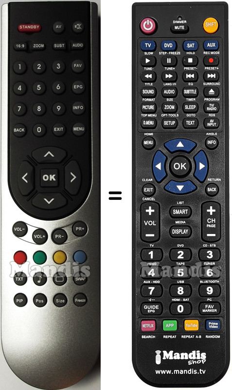 Abaixo, mostraremos a correspondência entre cada botão no controle remoto original e o botão que executa a mesma função no controle remoto de substituição. Em alguns casos, pode ser necessário pressionar a tecla SHIFT antes de pressionar outro botão para realizar determinadas ações. Essas funções adicionais geralmente não são amplamente utilizadas e são incluídas para facilitar o entendimento do controle remoto de substituição, ou porque o controle remoto original tem mais botões do que seu equivalente.