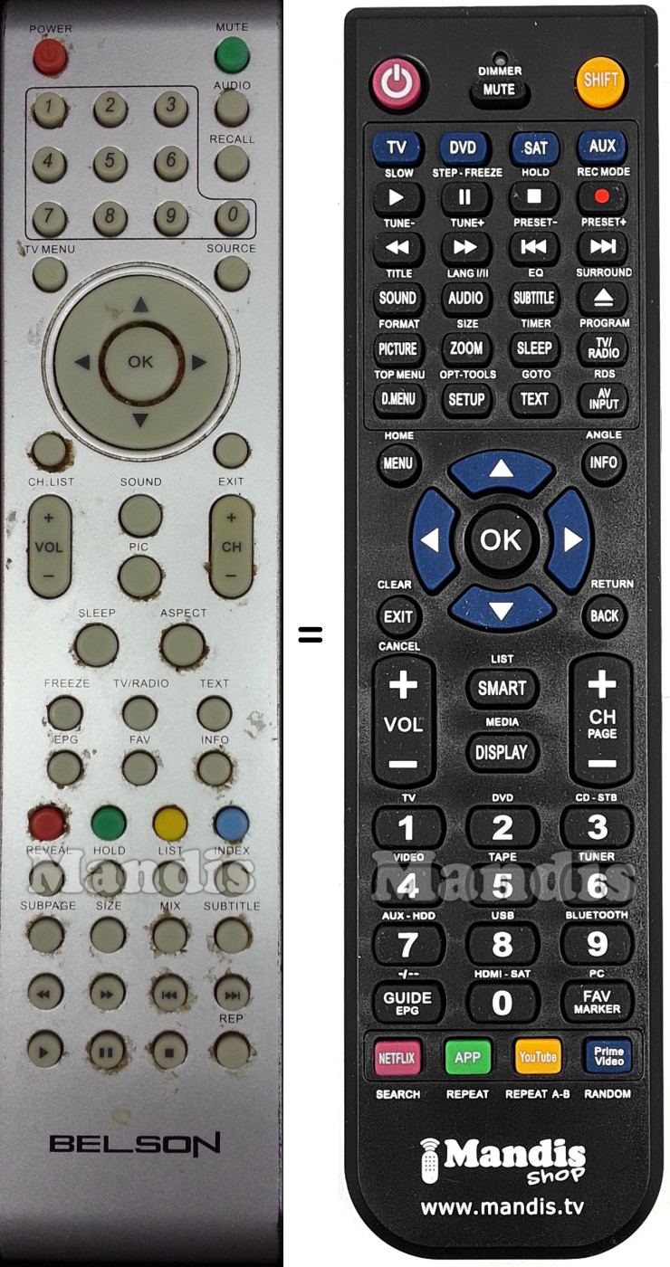 Abaixo, mostraremos a correspondência entre cada botão no controle remoto original e o botão que executa a mesma função no controle remoto de substituição. Em alguns casos, pode ser necessário pressionar a tecla SHIFT antes de pressionar outro botão para realizar determinadas ações. Essas funções adicionais geralmente não são amplamente utilizadas e são incluídas para facilitar o entendimento do controle remoto de substituição, ou porque o controle remoto original tem mais botões do que seu equivalente.