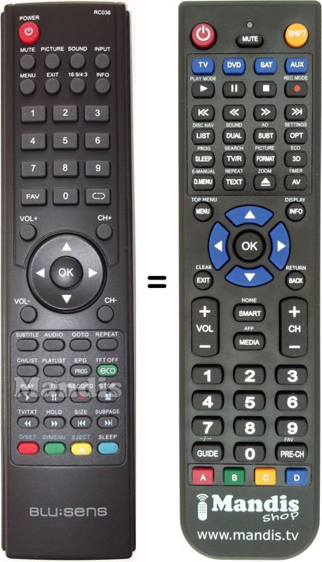 Comando à distância que substitui o original RC036 em todas as suas funções.