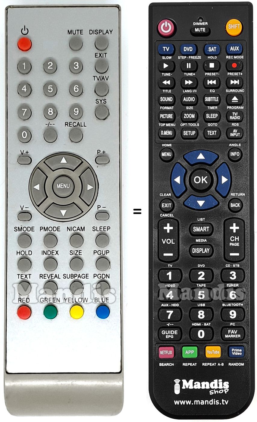 Abaixo, mostraremos a correspondência entre cada botão no controle remoto original e o botão que executa a mesma função no controle remoto de substituição. Em alguns casos, pode ser necessário pressionar a tecla SHIFT antes de pressionar outro botão para realizar determinadas ações. Essas funções adicionais geralmente não são amplamente utilizadas e são incluídas para facilitar o entendimento do controle remoto de substituição, ou porque o controle remoto original tem mais botões do que seu equivalente.