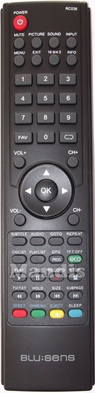 Comando à distância original RC036 da marca Blusens. Trata-se de um modelo original de comando à distância.