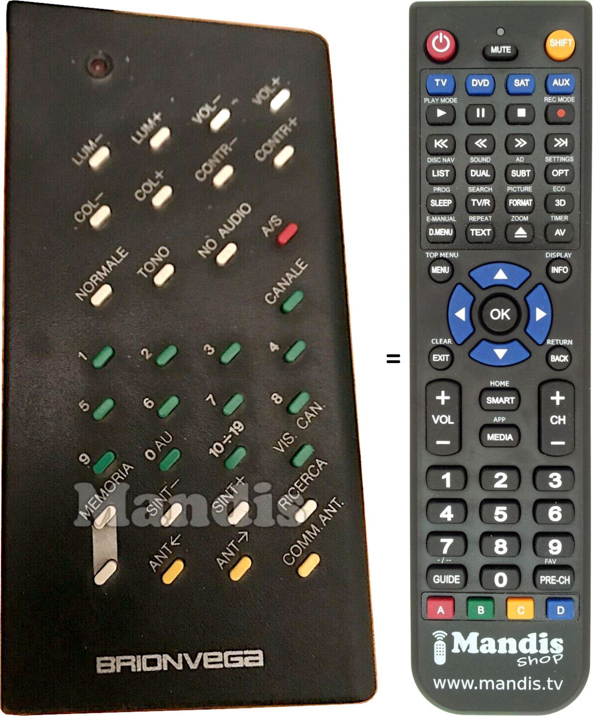 Este controle remoto executa todas as funções do controle remoto original: Lum-, Lum+, Vol-, Vol+, Col-, Col+, Contr-, Contr+, Normale, Tono L1-L2, No Audio, A/S, Canale, 1, 2, 3, 4, 5, 6, 7, 8, 9, 0 AU, 10÷19, Vis. Can., Memoria+, Memoria-, Sint-, Sint+, Ricerca, Ant←, Ant→, Comm. Ant.