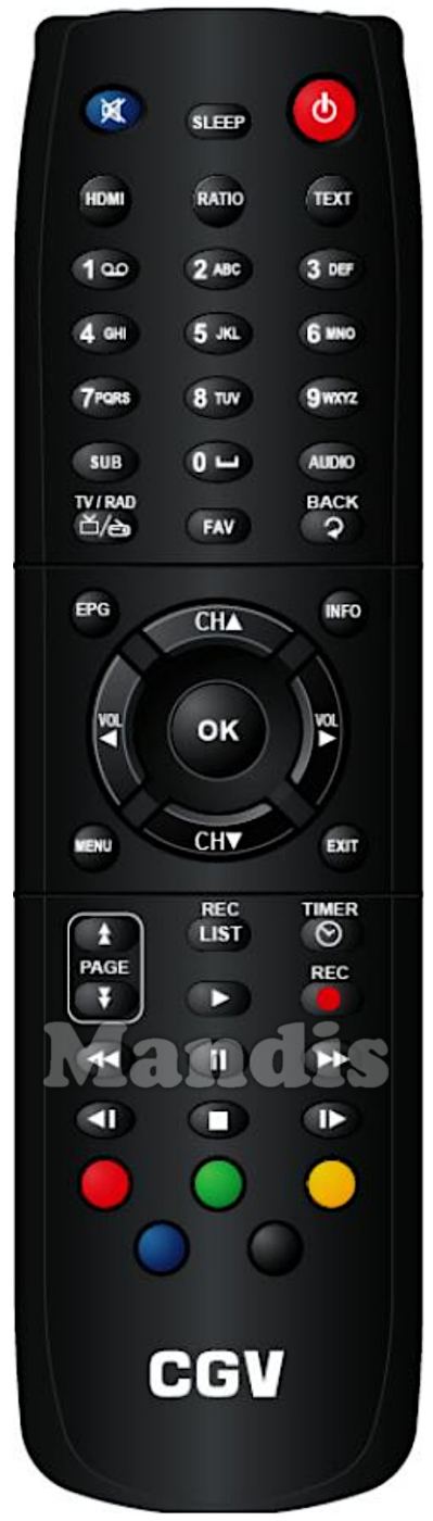 Power, Mute, Sleep, HDMI, Ratio, Text, 1, 2, 3, 4, 5, 6, 7, 8, 9, 0, Sub, Audio, Tv/Rad, FAV, Back, EPG, Info, Up / CH+, Down / CH-, Right / Vol+, Left / Vol-, OK, Menu, Exit, Page+, Page-, Rec List, Timer, Play, Rec, <<, Pause, >>, <I, Stop, I>, Red, Green, Yellow, Blue, Black