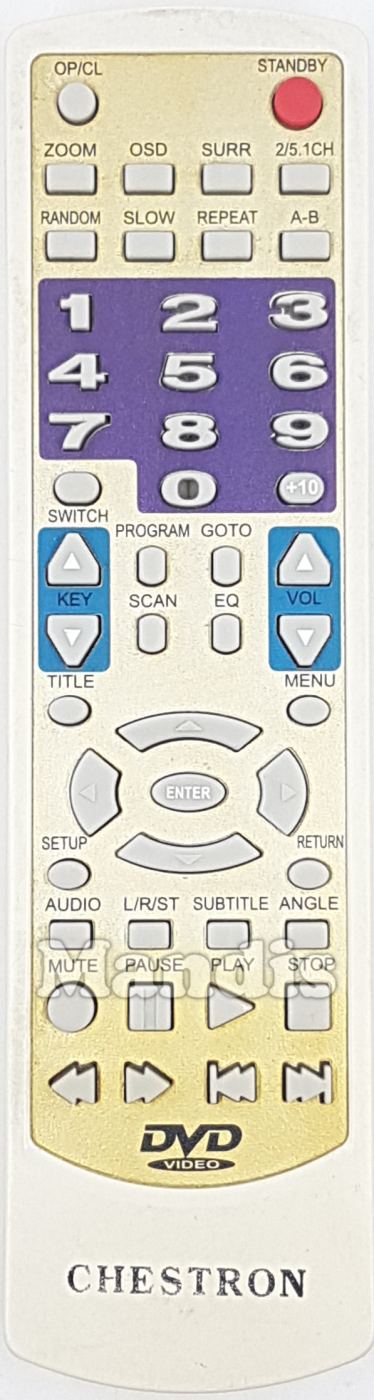 OP/CL, Standby, Zoom, OSD, SURR, 2/5. 1CH, Random, Slow, Repeat, A-B, 1, 2, 3, 4, 5, 6, 7, 8, 9, 0, Switch, +10, Key+, Key-, Program, Scan, GOTO, EQ, Vol+, Vol-, Title, Menu, Setup, Return, Audio, L/R/ST, Subtitle, Angle, Mute, Pause, Play, Stop, <<, >>, I<<, >>I, Up, Down, Left, Right, Enter