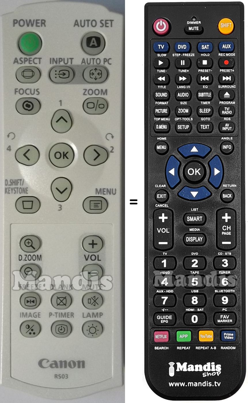 Abaixo, mostraremos a correspondência entre cada botão no controle remoto original e o botão que executa a mesma função no controle remoto de substituição. Em alguns casos, pode ser necessário pressionar a tecla SHIFT antes de pressionar outro botão para realizar determinadas ações. Essas funções adicionais geralmente não são amplamente utilizadas e são incluídas para facilitar o entendimento do controle remoto de substituição, ou porque o controle remoto original tem mais botões do que seu equivalente.