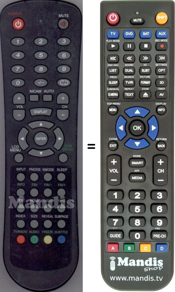 Abaixo, mostraremos a correspondência entre cada botão no controle remoto original e o botão que executa a mesma função no controle remoto de substituição. Em alguns casos, pode ser necessário pressionar a tecla SHIFT antes de pressionar outro botão para realizar determinadas ações. Essas funções adicionais geralmente não são amplamente utilizadas e são incluídas para facilitar o entendimento do controle remoto de substituição, ou porque o controle remoto original tem mais botões do que seu equivalente.