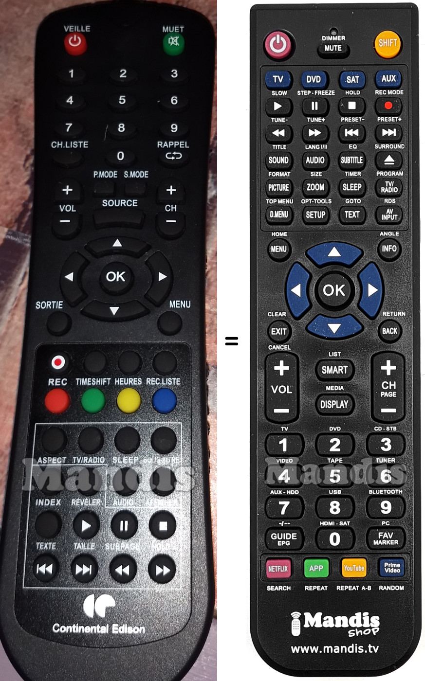 Abaixo, mostraremos a correspondência entre cada botão no controle remoto original e o botão que executa a mesma função no controle remoto de substituição. Em alguns casos, pode ser necessário pressionar a tecla SHIFT antes de pressionar outro botão para realizar determinadas ações. Essas funções adicionais geralmente não são amplamente utilizadas e são incluídas para facilitar o entendimento do controle remoto de substituição, ou porque o controle remoto original tem mais botões do que seu equivalente.