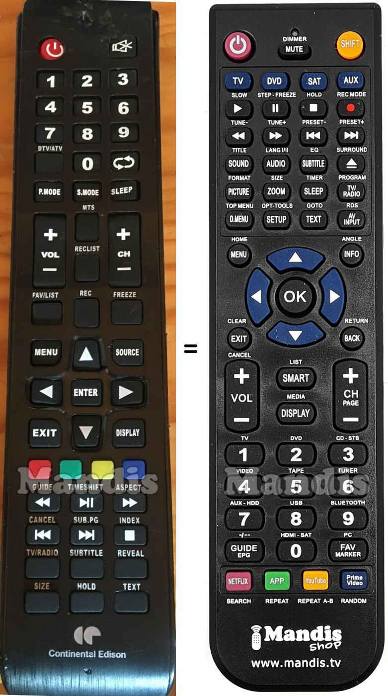Abaixo, mostraremos a correspondência entre cada botão no controle remoto original e o botão que executa a mesma função no controle remoto de substituição. Em alguns casos, pode ser necessário pressionar a tecla SHIFT antes de pressionar outro botão para realizar determinadas ações. Essas funções adicionais geralmente não são amplamente utilizadas e são incluídas para facilitar o entendimento do controle remoto de substituição, ou porque o controle remoto original tem mais botões do que seu equivalente.