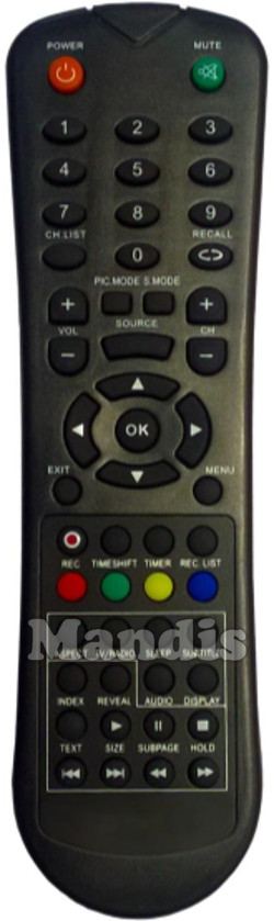 Power, Mute, 1, 2, 3, 4, 5, 6, 7, 8, 9, CH.List, 0, Recall, Vol+, Vol-, PIC.Mode, S.Mode, Source, CH+, CH-, Up, Down, Left, Right, OK, Exit, Menu, REC, Timeshift, Timer, Rec.List, Red, Green, Yellow, Blue, Aspect, Tv/Radio, Sleep, Subtitle, Index, Reveal, Audio, Display, Text, Play/Size, Pause/Subpage, Stop/Hold, I<<, >>I, <<, >>