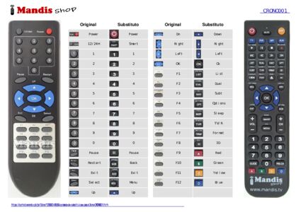 Abaixo, mostraremos a correspondência entre cada botão no controle remoto original e o botão que executa a mesma função no controle remoto de substituição. Em alguns casos, pode ser necessário pressionar a tecla SHIFT antes de pressionar outro botão para realizar determinadas ações. Essas funções adicionais geralmente não são amplamente utilizadas e são incluídas para facilitar o entendimento do controle remoto de substituição, ou porque o controle remoto original tem mais botões do que seu equivalente.