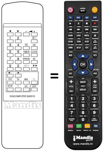Comando à distância que substitui o original DIGICOMPUTER 33 KEYS em todas as suas funções.