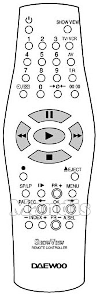 Power, Show View, 1, 2, 3, 4, 5, 6, 7, 8, 9, 0, TV/VCR, AV, T.R., ◷ / [ · ], →0←, 00:00, Pause, <<, Play, >>, Stop, Rec, Eject, SP/LP, I>, Up / PR+, Menu, Pal/Sec, Left, OK, Right, Index-, Index+, Down / PR-, A.Sel