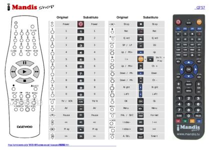 Abaixo, mostraremos a correspondência entre cada botão no controle remoto original e o botão que executa a mesma função no controle remoto de substituição. Em alguns casos, pode ser necessário pressionar a tecla SHIFT antes de pressionar outro botão para realizar determinadas ações. Essas funções adicionais geralmente não são amplamente utilizadas e são incluídas para facilitar o entendimento do controle remoto de substituição, ou porque o controle remoto original tem mais botões do que seu equivalente.