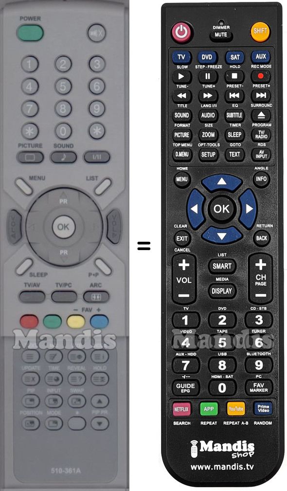 Abaixo, mostraremos a correspondência entre cada botão no controle remoto original e o botão que executa a mesma função no controle remoto de substituição. Em alguns casos, pode ser necessário pressionar a tecla SHIFT antes de pressionar outro botão para realizar determinadas ações. Essas funções adicionais geralmente não são amplamente utilizadas e são incluídas para facilitar o entendimento do controle remoto de substituição, ou porque o controle remoto original tem mais botões do que seu equivalente.