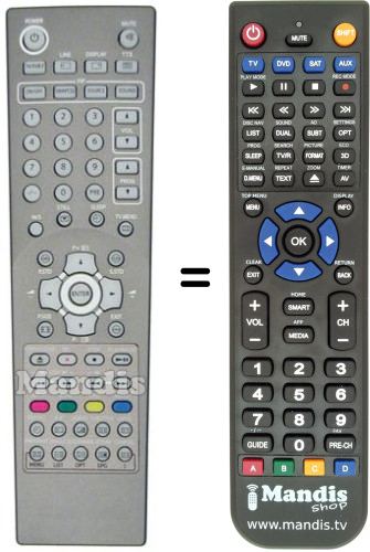 Este controle remoto executa todas as funções do controle remoto original: Power, Mute, TV/DVB-T, Line, Display, TTX, PIP ON/OFF, PIP Swap, PIP Source, PIP Sound, 1, 2, 3, 4, 5, 6, 7, 8, 9, 0, -/--, PRE, Vol+, Vol-, Prog+, Prog-, M/S, Still, Sleep, TV Menu, P.STD, S.STD, Up / P+, Down / P-, Right / Vol+, Left / Vol-, Enter, P.Size, Exit, Open / Close, Rec, Stop, Play / Pause, << / <I Slow, >> / Slow I>, I<< / <II Step, >>I / Step II>, Red / Setup, Green / Input, Yellow / Title, Blue / Menu, Repeat, A-B, Audio, Subtitle, Goto, Program / Menu, Angle / List, Bookmark / OPT, Zoom / EPG, Cancel / i