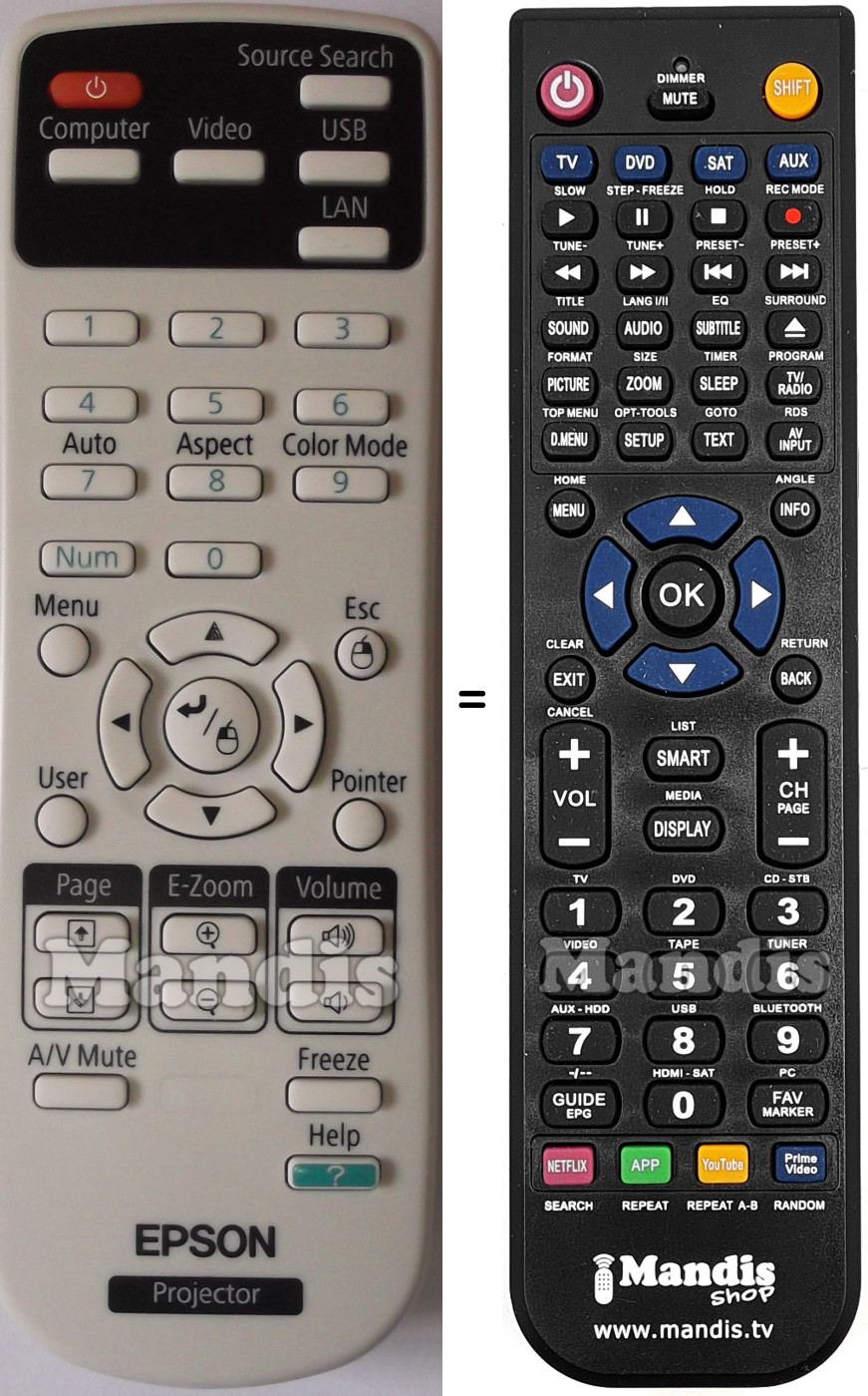 Abaixo, mostraremos a correspondência entre cada botão no controle remoto original e o botão que executa a mesma função no controle remoto de substituição. Em alguns casos, pode ser necessário pressionar a tecla SHIFT antes de pressionar outro botão para realizar determinadas ações. Essas funções adicionais geralmente não são amplamente utilizadas e são incluídas para facilitar o entendimento do controle remoto de substituição, ou porque o controle remoto original tem mais botões do que seu equivalente.
