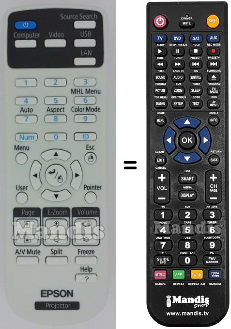 Este controle remoto executa todas as funções do controle remoto original: Power, Source Search, Computer, Video, USB, LAN, 1, 2, 3, 4, 5, MHL Menu, Auto, Aspect, 6, Color Mode, 7, 8, 9, 0, Menu, Esc, User, Pointer, Up, Down, Right, Left, Enter, A/V Mute, Split, Freeze, ?/Help, Page Up, Page Down, E-Zoom+, E-Zoom-, Vol+, Vol-, ID