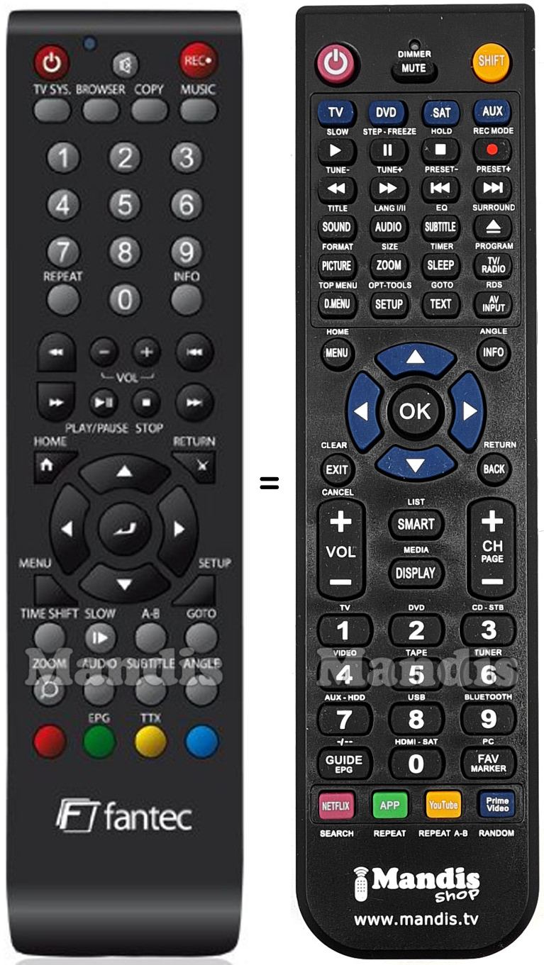 Abaixo, mostraremos a correspondência entre cada botão no controle remoto original e o botão que executa a mesma função no controle remoto de substituição. Em alguns casos, pode ser necessário pressionar a tecla SHIFT antes de pressionar outro botão para realizar determinadas ações. Essas funções adicionais geralmente não são amplamente utilizadas e são incluídas para facilitar o entendimento do controle remoto de substituição, ou porque o controle remoto original tem mais botões do que seu equivalente.